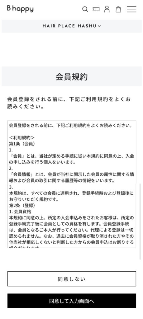 下記の画面から、会員規約の確認後「同意して入力画面へ」を押下します。