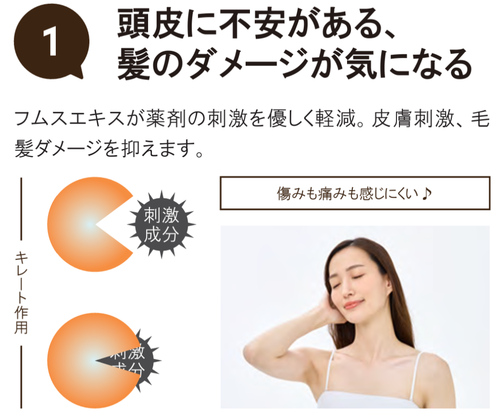フムスエキスは、天然ミネラルとアミノ酸を豊富に含む成分で、カラー剤に配合する事で施術中の刺激や乾燥を抑えながら、頭皮環境を整え、ツヤとまとまりのある仕上がりに導きます。